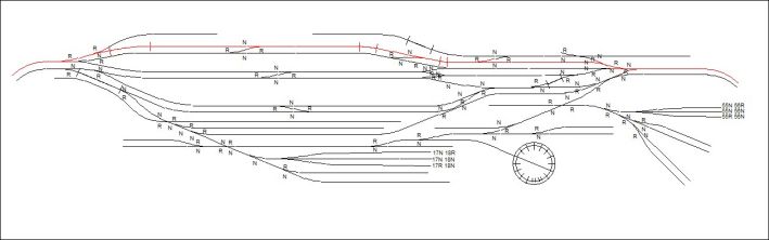 Routes, Presets & MacrosMost DCC operating systems offer the facility to program complex switching operations by pressing one button. This is usually associated with setting track routes via accessory decoders but this can also involve signals and other accessories. Manufacturers use different terms for this process including Routes, Presets and Macros. The maximum number of routes and settings within a route varies depending on the system memory. For example Prodigy Advance2 offer 32 routes with a maximum of eight switches per route, whereas the ZTC511 offers around ten routes as supplied (number of routes depends on the number of settings per route) but can be upgraded to a maximum of 256. PLS Layouts offer a full route program service which can be included in the setup of your DCC system, or as a separate service. To help illustrate this process we have used a layout based on Newton Abbott to show the stages involved in route setting. The track plan must be drawn as a schematic to show all the turnouts on the layout. The plan can be similar to those often seen on schematic control panels (like a signal box panel) or more artistic as shown below by our CAD drawing.
