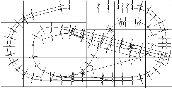 Plan 2 This modified HO Fleischmann track plan was altered to fit a specific area 6.5m x 2.25m. PLS constructed the baseboards for this project. The blue lines mark the proposed baseboard joins.