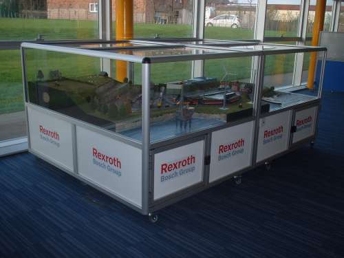 Bosch Rexroth scenic layout for the JCB AcademyThis commercial commission uses a scenic model railway to illustrate the use of products manufactured by Bosch Rexroth, the power and control company for display at the JCB Academy, Staffordshire. The model railway and accessories are controlled by analogue timers..