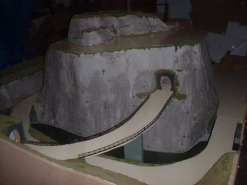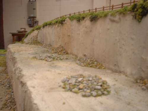 Once complete some realistic effects can be achieved. The image left below shows the baseboards shown throughout the scenic section of this website at their delivery degree of finish ready to be detailed by the client. The right image shows the importance of colour blending using water colours to achieve the final finish together with the careful use of scenic effects e.g. vegetation and talus.