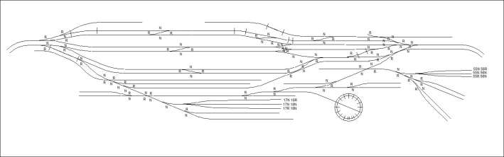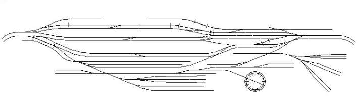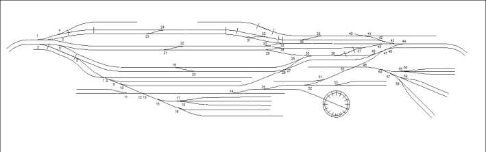 Routes, Presets & MacrosMost DCC operating systems offer the facility to program complex switching operations by pressing one button. This is usually associated with setting track routes via accessory decoders but this can also involve signals and other accessories. Manufacturers use different terms for this process including Routes, Presets and Macros. The maximum number of routes and settings within a route varies depending on the system memory. For example Prodigy Advance2 offer 32 routes with a maximum of eight switches per route, whereas the ZTC511 offers around ten routes as supplied (number of routes depends on the number of settings per route) but can be upgraded to a maximum of 256. PLS Layouts offer a full route program service which can be included in the setup of your DCC system, or as a separate service. To help illustrate this process we have used a layout based on Newton Abbott to show the stages involved in route setting. The track plan must be drawn as a schematic to show all the turnouts on the layout. The plan can be similar to those often seen on schematic control panels (like a signal box panel) or more artistic as shown below by our CAD drawing.