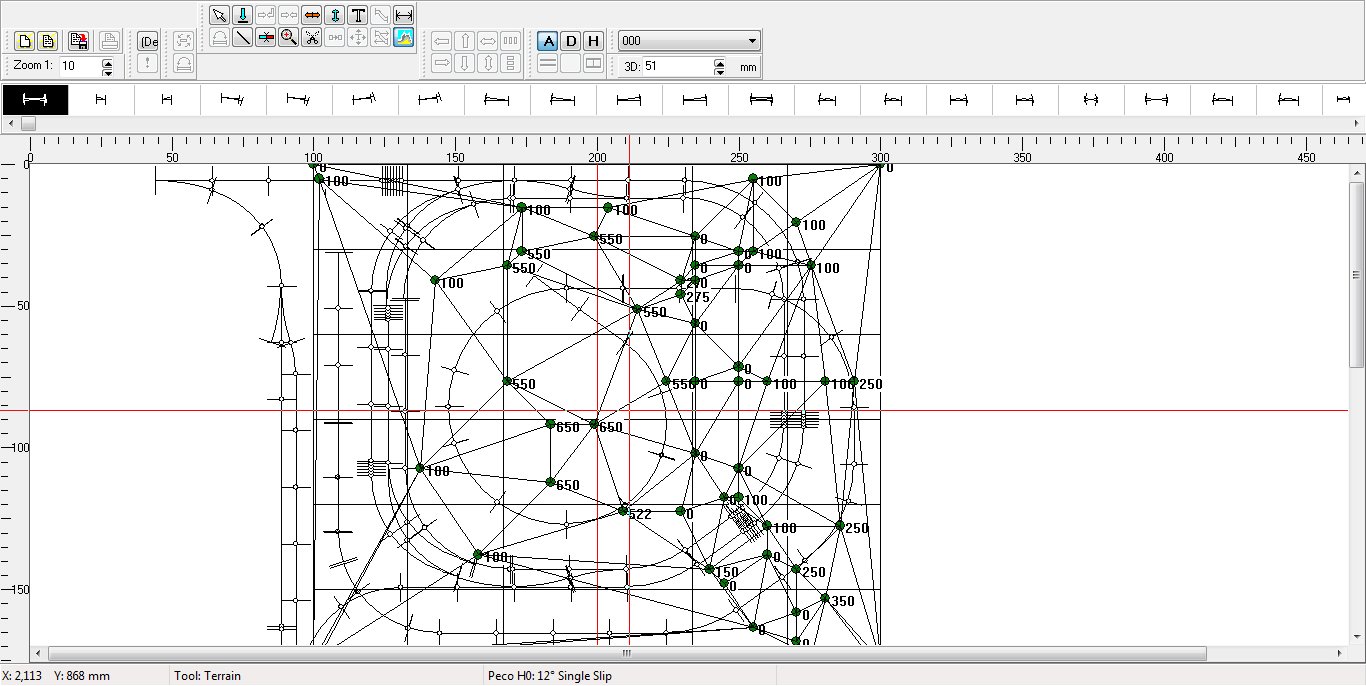 WinRail screen shot showing the track plan with scenic node points showing altitude from the river at datum. The node points are then used to create a 3D image as shown below.