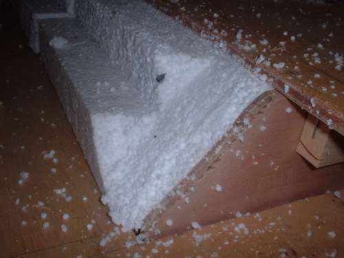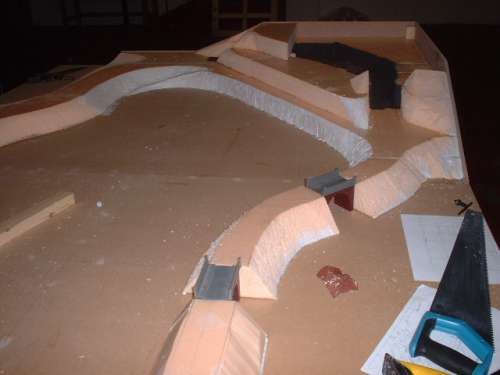 THE STRUCTURAL SUPPORTThe nature of the structural support depends upon the type of model railway under construction. The railway companies and engineers of Great Britain were fortunate that most of our population centres are not in remote areas and therefore connecting these centres was often easier than some of their European and American counterparts. Railways of the UK feature cuttings, embankments, tunnels and bridges simply to keep the gradients as shallow as possible, we do not have the need for some of the extreme engineering used in other regions of the world. As such most UK based model railway layouts scenically are simple featuring undulating terrain which does not require extravagant structural support. This can usually be achieved using polystyrene sheets or a weave of cardboard strengthened and waterproofed with varnish. The image below left shows this method under construction integrated with plywood track supports. A more expensive construction foam can be used as shown in the images to the right. This foam has a greater density when compared to polystyrene and does not suffer from the 'debris' problems shown in the left image. Both types of foam can be cut with a hot wire cutter to reduce debris - please follow manufacturers instructions regarding foam vapour.
