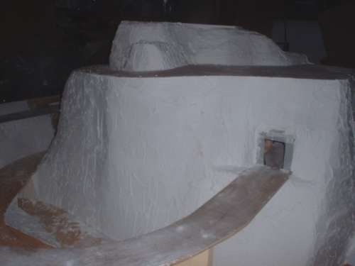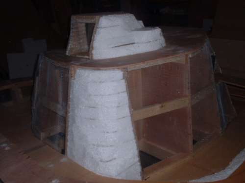 COMPLETING THE STRUCTURAL WORKOnce the structural support is in place a covering is required to form the base landscape. Where timber supports have been used we prefer to form the landscape from 6mm square galvanised pet mesh covered with plaster bandage. This mesh is more expensive than chicken wire but is fine enough to prevent the plaster bandage sagging into the mesh which may show on the finished product. Where mesh work cannot be used we follow the method outlined above using sheets of 50mm polystyrene sheet obtained from builders merchants. The images below show how the above baseboards move towards completion using these methods.
